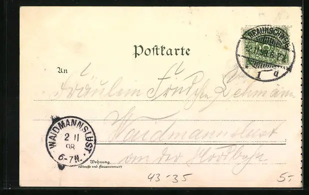 Personenbezogene Daten auf der Rückseite der Karte wurden durch blauen Textmarker unkenntlich gemacht. Die blauen Stellen sind auf die Vorderseite durchgeweicht und wirken sich negativ auf das Postkartenfoto aus