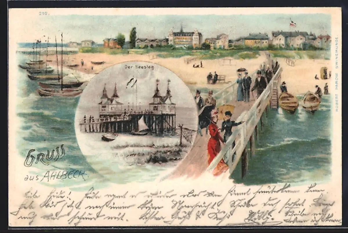 Lithographie Ahlbeck / Ostseebad, Seesteg, Strandpartie