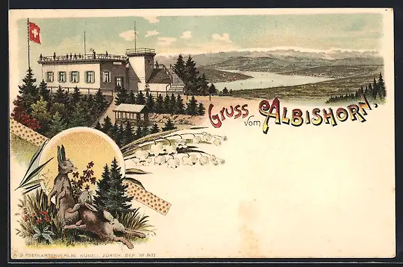 Lithographie Albishorn, Gasthaus, Hasen
