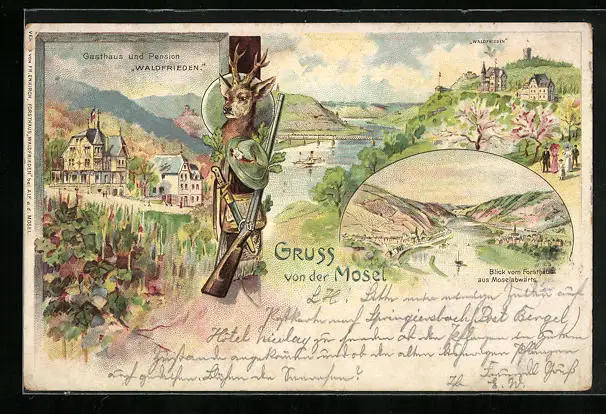 Lithographie Alf, Gasthaus Waldfrieden, Blick Moselabwärts