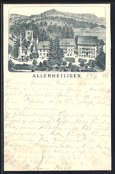 Lithographie Allerheiligen, Ortsansicht mit der Ruine