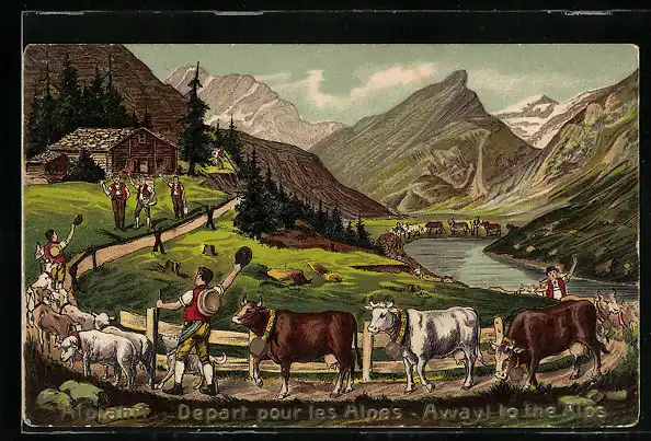 Lithographie Alpfahrt, Almauftrieb, Rinder