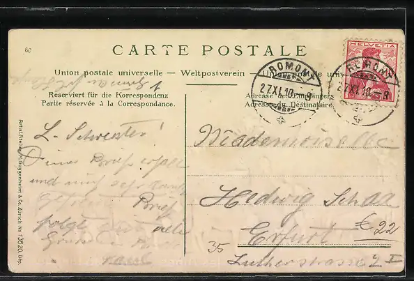 Personenbezogene Daten auf der Rückseite der Karte wurden durch blauen Textmarker unkenntlich gemacht. Die blauen Stellen sind auf die Vorderseite durchgeweicht und wirken sich negativ auf das Postkartenfoto aus