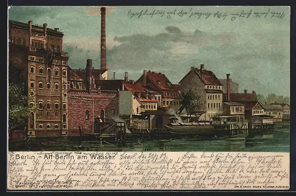 Lithographie Alt-Berlin, Häuser am Wasser in Alt-Berlin