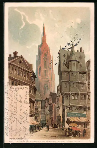 Lithographie Alt-Frankfurt, Alter Markt mit Blick zur Kirche, Fluthmer