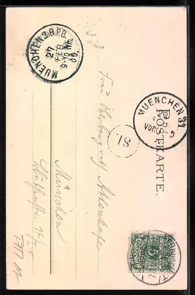 Personenbezogene Daten auf der Rückseite der Karte wurden durch blauen Textmarker unkenntlich gemacht. Die blauen Stellen sind auf die Vorderseite durchgeweicht und wirken sich negativ auf das Postkartenfoto aus