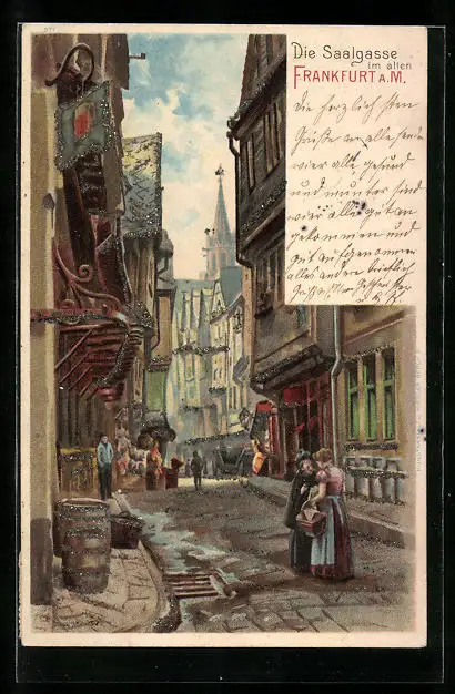 Lithographie Alt-Frankfurt, Die alte Saalgasse mit Glitzerperlen