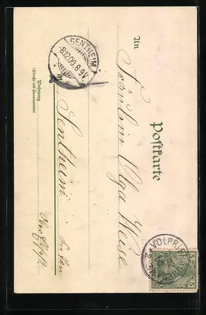 Personenbezogene Daten auf der Rückseite der Karte wurden durch blauen Textmarker unkenntlich gemacht. Die blauen Stellen sind auf die Vorderseite durchgeweicht und wirken sich negativ auf das Postkartenfoto aus