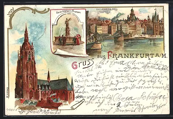 Lithographie Alt-Frankfurt, Dom, Gerechtigkeits Brunnen, Der eiserne Steg