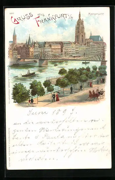 Lithographie Alt-Frankfurt, Mainansicht mit Brücke