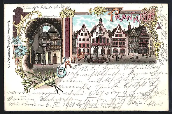 Lithographie Alt-Frankfurt, Römer mit neuer Facade, Spindeltreppe
