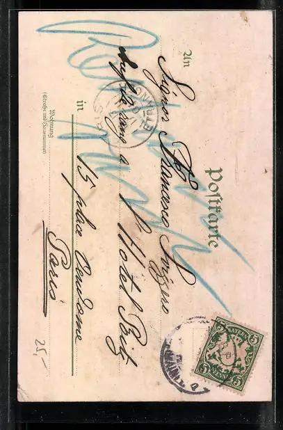 Personenbezogene Daten auf der Rückseite der Karte wurden durch blauen Textmarker unkenntlich gemacht. Die blauen Stellen sind auf die Vorderseite durchgeweicht und wirken sich negativ auf das Postkartenfoto aus
