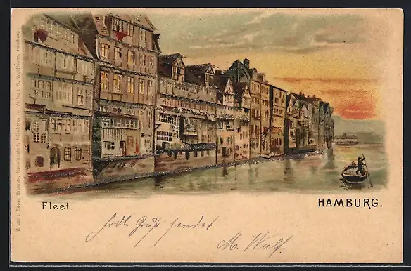 Lithographie Alt-Hamburg, Häuserpartie am Fleet
