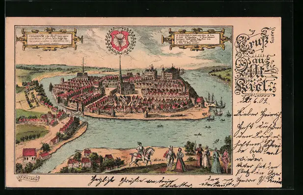 Lithographie Alt-Kiel, Totalansicht mit Kirche anno 1580