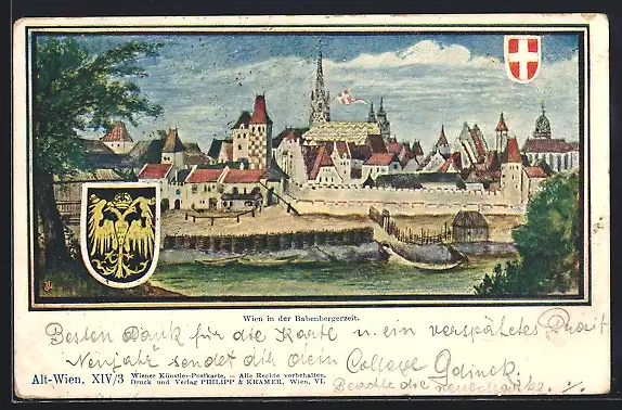 Lithographie Alt-Wien, Teilansicht in der Babenbergerzeit, Wappen