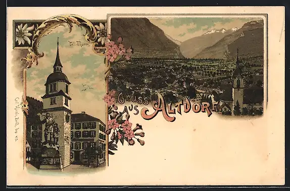 Lithographie Altdorf, Teilansicht, Tell-Turm