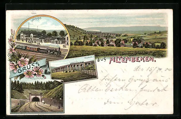 Lithographie Altenbeken, Ortsansicht mit Viadukt, Bahnhof, Tunnel-Portal
