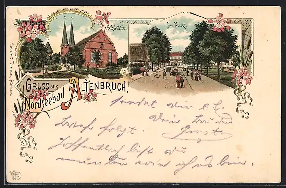 Lithographie Altenbruch, Strassenpartie am Markt, St. Nikolaikirche