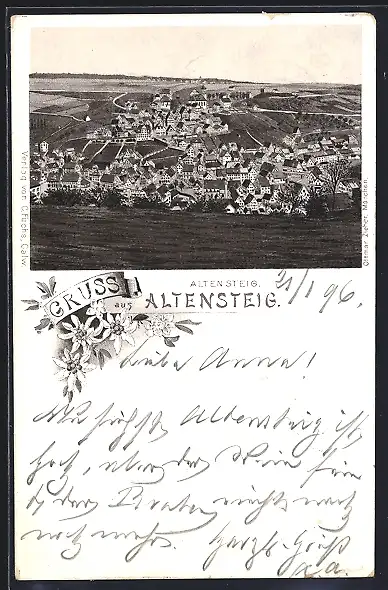 Lithographie Altensteig, Panoramablick auf das Dorf