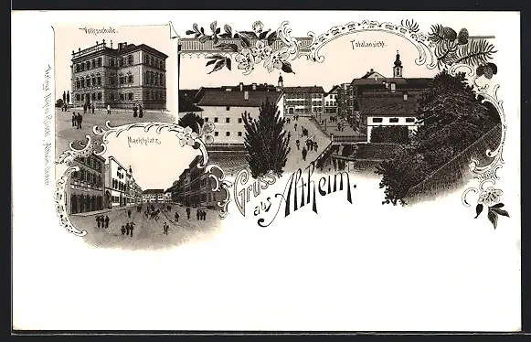 Lithographie Altheim, Marktplatz, Volksschule, Strassenpartie im Ort