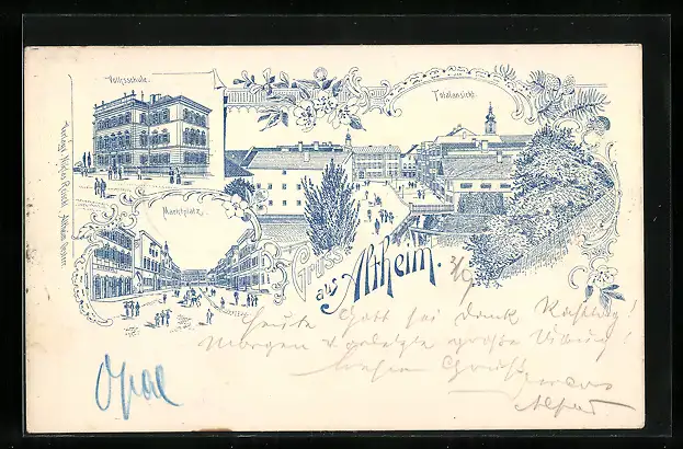 Lithographie Altheim, Volksschule, Marktplatz, Totalansicht