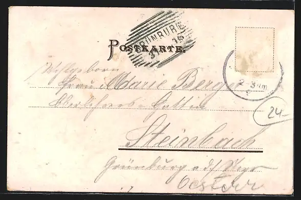 Personenbezogene Daten auf der Rückseite der Karte wurden durch blauen Textmarker unkenntlich gemacht. Die blauen Stellen sind auf die Vorderseite durchgeweicht und wirken sich negativ auf das Postkartenfoto aus