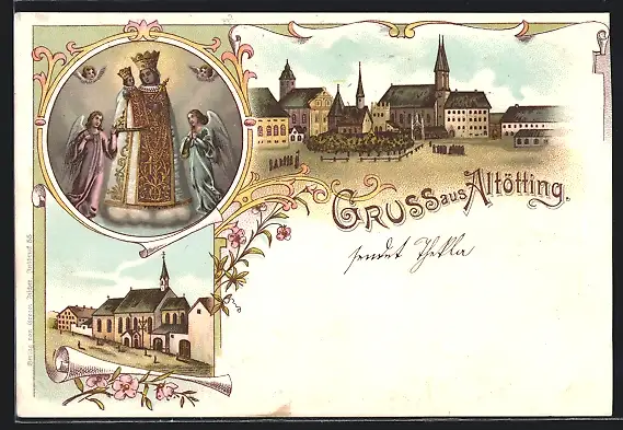 Lithographie Altötting, Kapellplatz mit Doppelturmkirche, Gnadenmutter