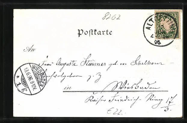 Personenbezogene Daten auf der Rückseite der Karte wurden durch blauen Textmarker unkenntlich gemacht. Die blauen Stellen sind auf die Vorderseite durchgeweicht und wirken sich negativ auf das Postkartenfoto aus