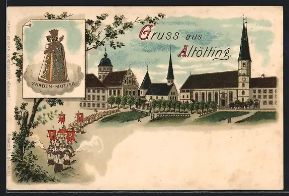 Lithographie Altötting, Kirche mit Prozession, Gnaden-Mutter
