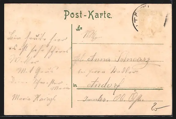 Personenbezogene Daten auf der Rückseite der Karte wurden durch blauen Textmarker unkenntlich gemacht. Die blauen Stellen sind auf die Vorderseite durchgeweicht und wirken sich negativ auf das Postkartenfoto aus