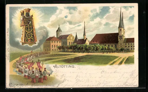 Lithographie Altötting, Kirche mit Prozession, Madonnenfigur