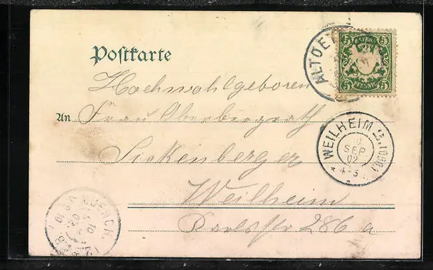 Personenbezogene Daten auf der Rückseite der Karte wurden durch blauen Textmarker unkenntlich gemacht. Die blauen Stellen sind auf die Vorderseite durchgeweicht und wirken sich negativ auf das Postkartenfoto aus