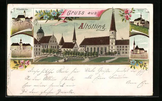 Lithographie Altötting, Michaelskirche, Kapuziner Kirche
