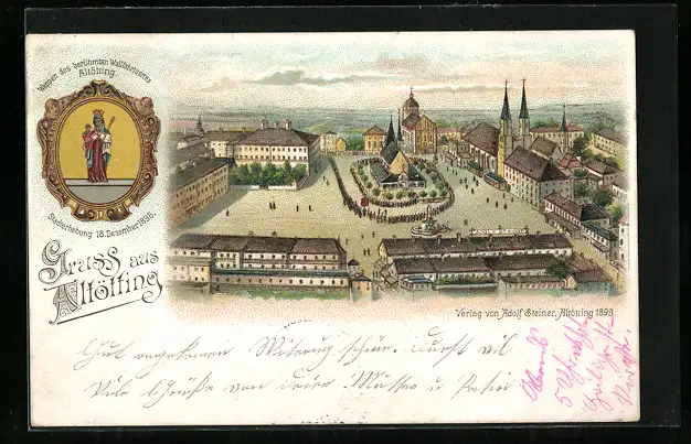 Lithographie Altötting, Ortsansicht, Stadtwappen