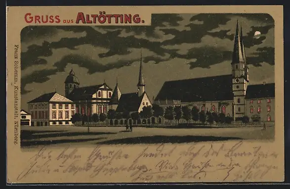 Lithographie Altötting, Ortspartie mit Kirche