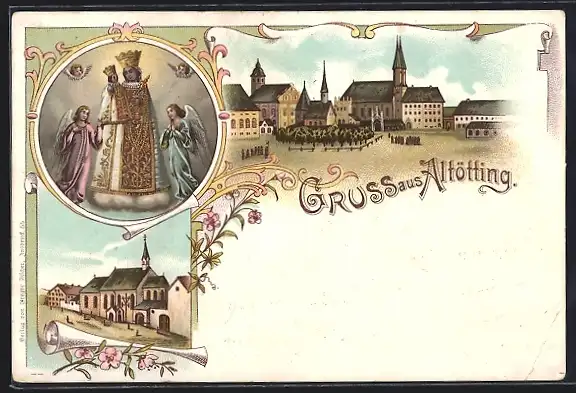 Lithographie Altötting, Partie mit Kirche und Marienbild