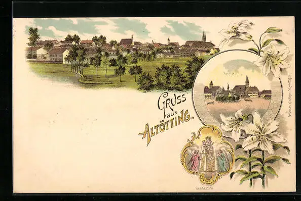 Lithographie Altötting, Teilansicht, Kirche, Gnadenbild
