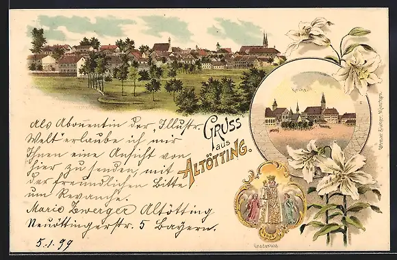 Lithographie Altötting, Teilansicht, Kirche, Gnadenbild