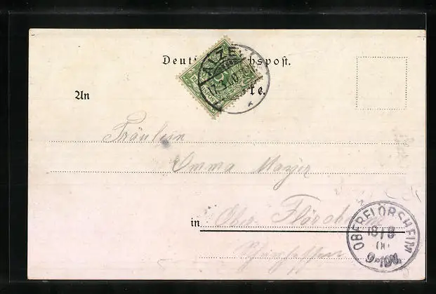 Personenbezogene Daten auf der Rückseite der Karte wurden durch blauen Textmarker unkenntlich gemacht. Die blauen Stellen sind auf die Vorderseite durchgeweicht und wirken sich negativ auf das Postkartenfoto aus