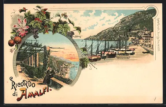 Lithographie Amalfi, Boote im Hafen, Blick von den Terrassen