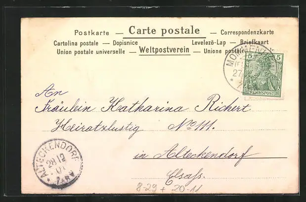 Personenbezogene Daten auf der Rückseite der Karte wurden durch blauen Textmarker unkenntlich gemacht. Die blauen Stellen sind auf die Vorderseite durchgeweicht und wirken sich negativ auf das Postkartenfoto aus