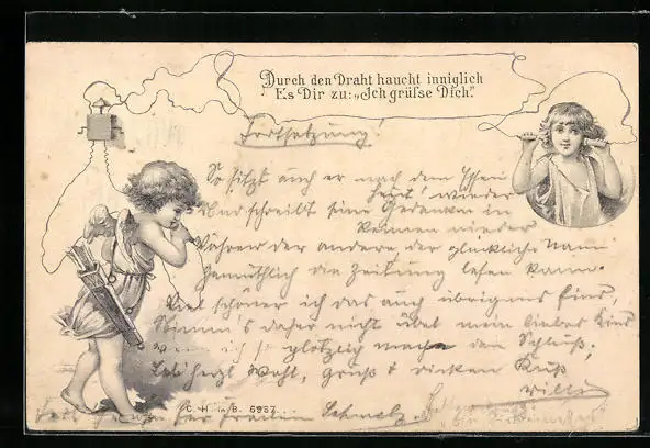 Lithographie Amor sendet Liebesbotschaft durchs Telefon