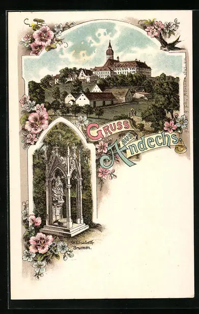 Lithographie Andechs, Ortspartie mit Kloster, St. Elisabeth-Brunnen