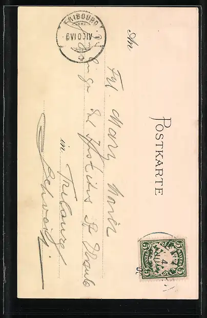 Personenbezogene Daten auf der Rückseite der Karte wurden durch blauen Textmarker unkenntlich gemacht. Die blauen Stellen sind auf die Vorderseite durchgeweicht und wirken sich negativ auf das Postkartenfoto aus