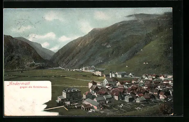 Lithographie Andermatt, Stadtansicht gegen die Schöllenen