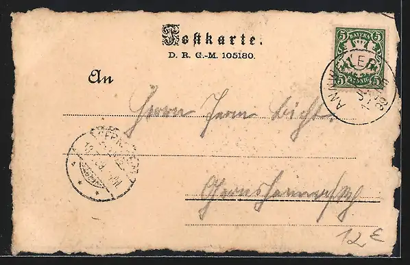 Personenbezogene Daten auf der Rückseite der Karte wurden durch blauen Textmarker unkenntlich gemacht. Die blauen Stellen sind auf die Vorderseite durchgeweicht und wirken sich negativ auf das Postkartenfoto aus