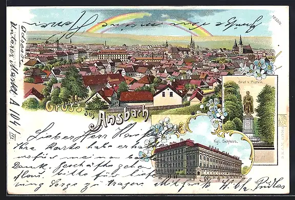 Lithographie Ansbach, Kgl. Schloss, Denkmal Graf von Platen, Gesamtansicht mit Regenbogen