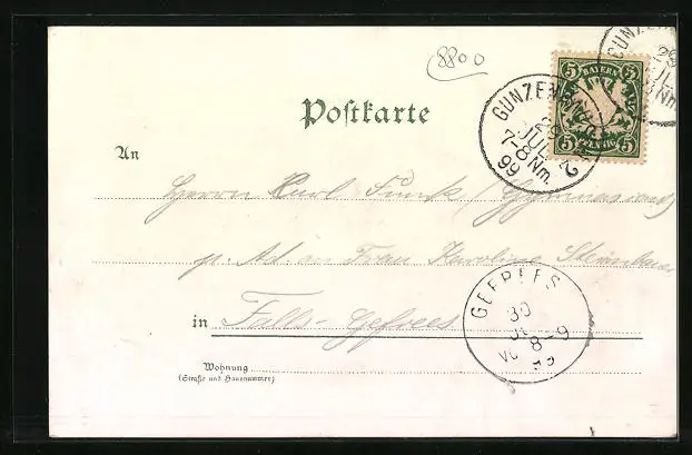 Personenbezogene Daten auf der Rückseite der Karte wurden durch blauen Textmarker unkenntlich gemacht. Die blauen Stellen sind auf die Vorderseite durchgeweicht und wirken sich negativ auf das Postkartenfoto aus