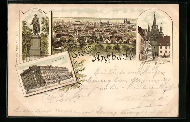 Lithographie Ansbach, Oberer Markt, Schloss, Teilansicht