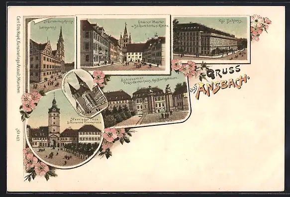 Lithographie Ansbach, Oberer Markt und St. Gumbertus-Kirche, Kgl. Schloss